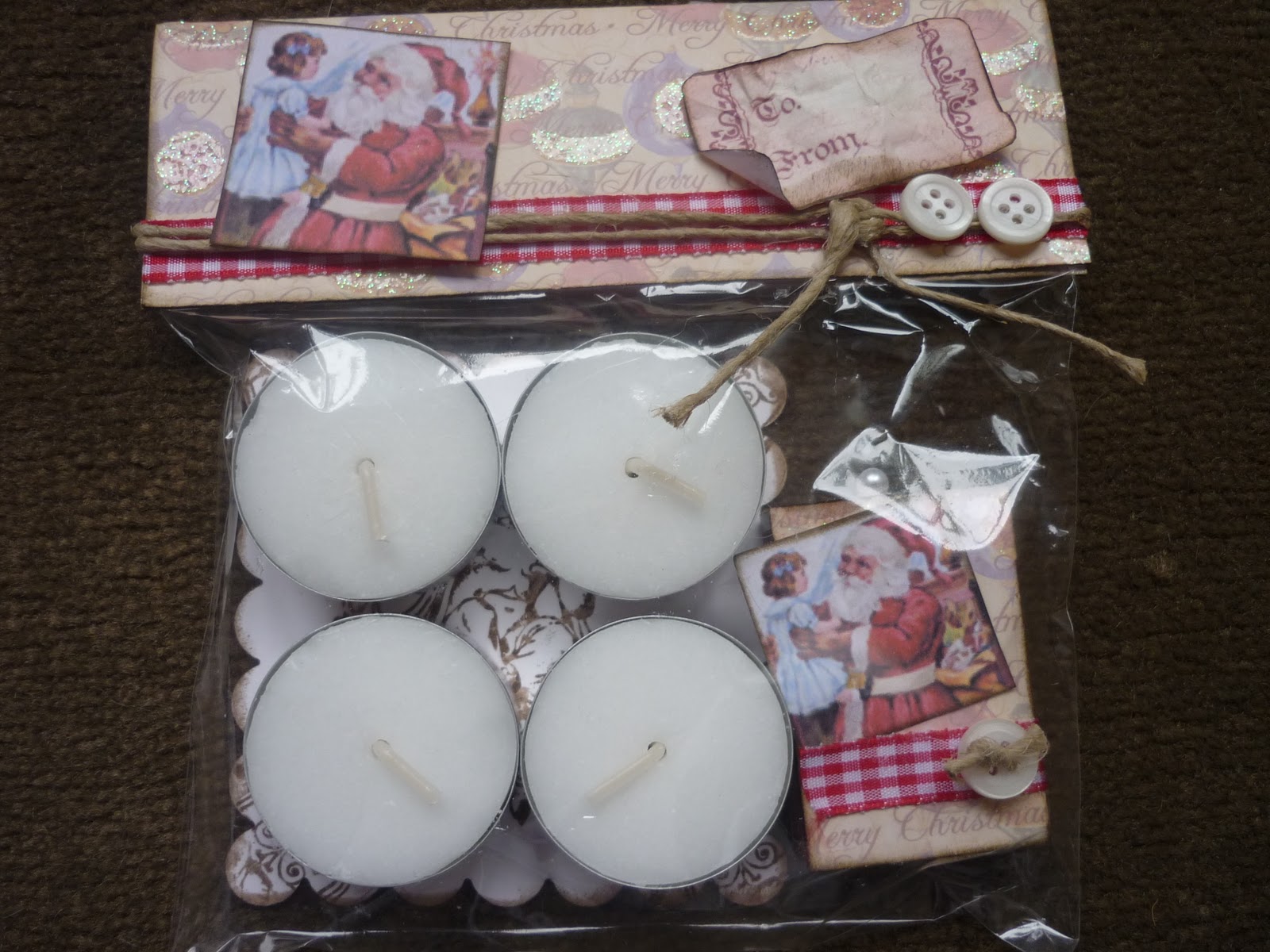 Deze keer waxinelichtjes in een zakje met een leuk gepimpt luciferdoosje.